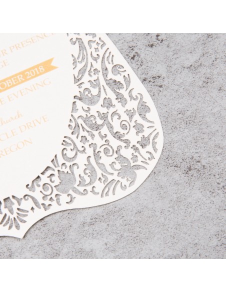 Un faire-part de mariage avec une délicate découpe laser d'arabesques romantique, imprimé et découpé dans un papier de création. Une réalisation toute en élégance pour annoncer vos futures noces.