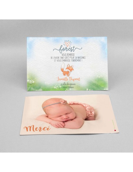 Carte de remerciements naissance dans le thème forêt en aquarelle pour remercier vos proches.