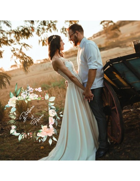 Une carte de remerciement assortie au faire part de la collection Alexis, thème couronne de fleurs champêtre bohème et couleurs pêche et nude avec couleurs personnalisables.