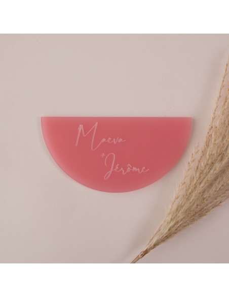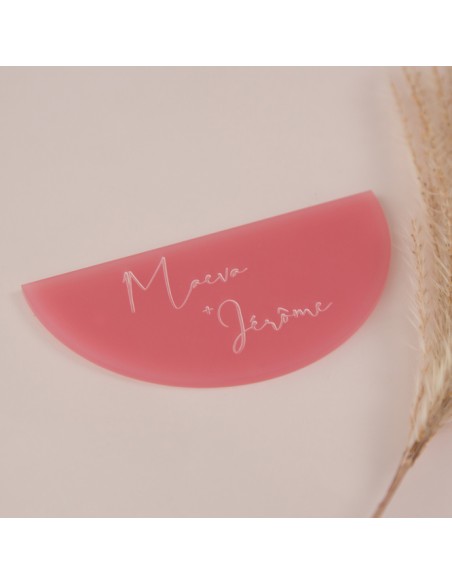 Etiquette personnalisée et gravée en forme de demi-cercle.