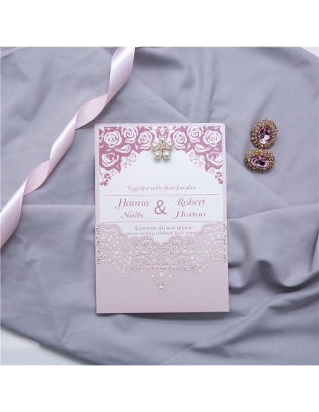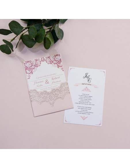 Un élégant faire-part de mariage avec sa pochette romantique rose poudré en dentelle dans laquelle on glisse un carton d'invitation.