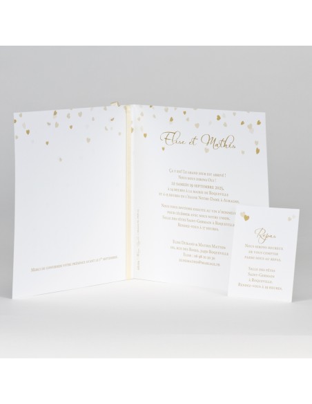 Un faire-part mariage sur le thème du romantisme pour témoigner de votre amour à vos proches. Le texte et les cœurs sur la pochette ont un effet or brillant pour donner un côté chic et élégant à vos invitations.
