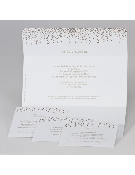 Un faire-part chic sous forme d'une pochette vert d'eau avec une belle dorure Or de feuillage, ce faire-part est accompagné de 3 petits cartons.