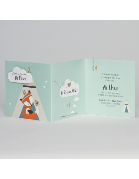 Faire-part de naissance plié deux fois sur fond de couleur vert d'eau décoré d'un sympathique renard devant son tipi.