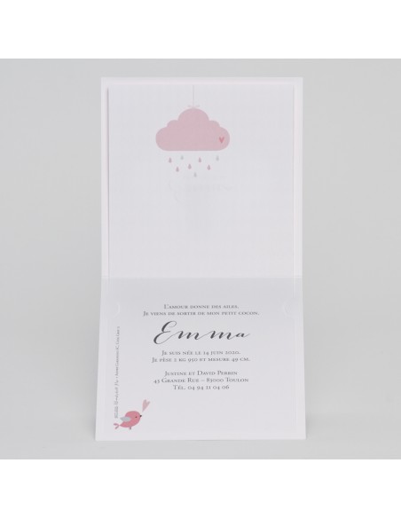 Faire-part de naissance gris et rose pastels avec damier en losange à l'intérieur. Le prénom de votre enfant apparait au travers d'un nuage découpé sur la première page.