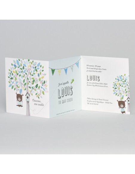 faire-part de naissance pour garçon plié deux fois pour un style original, imprimé du dessin d'un arbre coloré sur lequel se balance un ourson. Vous avez le chois de l'enveloppe de couleur sans supplément. Notre préférence: enveloppe marron.