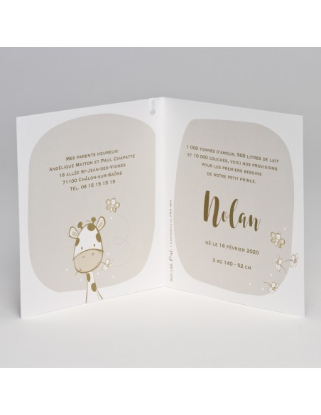 Faire-part de naissance mixte blanc et beige, décoré du dessin amusant d'une girafe et d'un petit papillon.