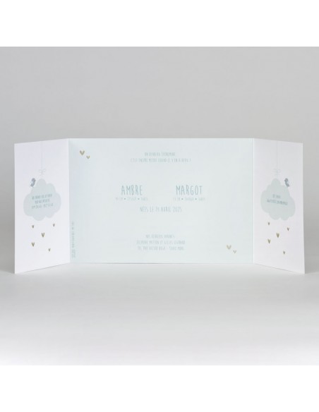 Faire-part de naissance jumeaux avec ouverture deux fenêtres de couleur vert d'eau. Les petits nuages et dorures or pour une belle finition tout en élégance, séduira votre entourage.