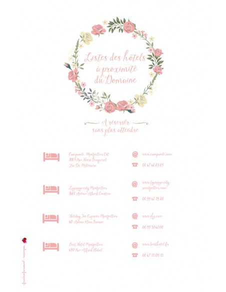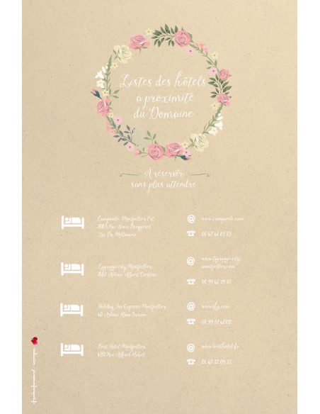 Carton supplémentaire Hébergements à rajouter à votre faire-part de mariage assorti au visuel de la collection Sarah pour indiquer la liste des hébergements à vos convives.
