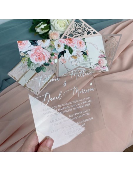 Pack Faire-Part Mariage en plexiglas Romantique avec fleurs - Modèle 38
