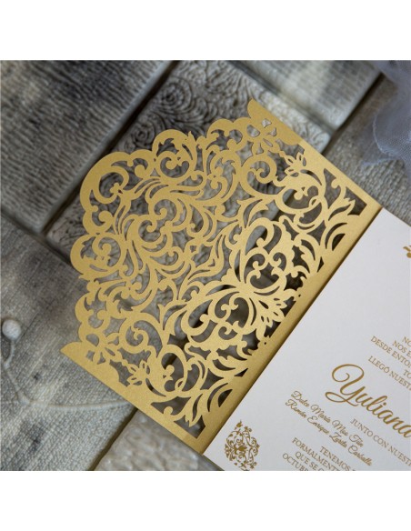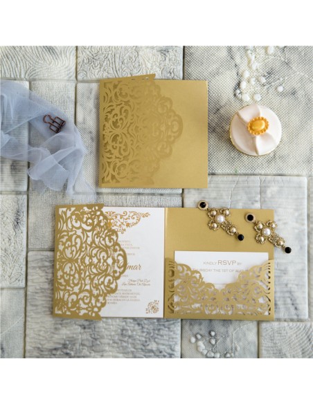 Faire-part de Mariage Pocket Folder 3 volets avec un rabat ciselé et raffinée avec une fine dentelle très élégant.