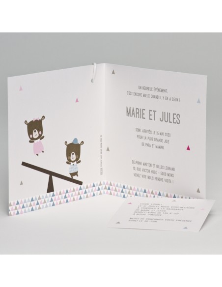 Faire-part de naissance pour jumeaux garçon et fille, décoré de deux oursons garçon et fille jouant sur une balançoire. Les deux prénoms sont imprimés sur une étiquette jointe.