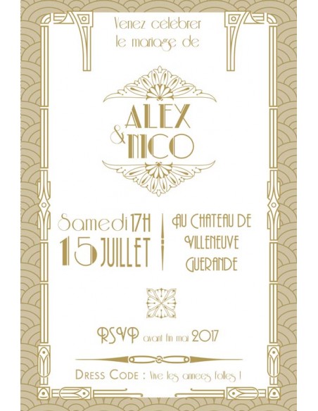 Ce modèle au thème art déco années folles doré est à personnaliser avec vos textes et couleurs.