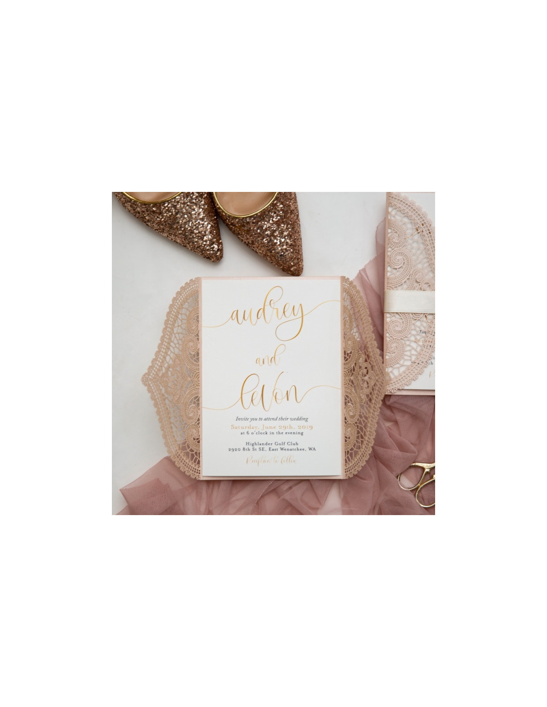 Une pochette dentelle thème vintage qui s'adaptera aussi pour un mariage oriental par sa forme de découpe. Un carton d'invitation crée sur-mesure avec l'un de nos graphistes.