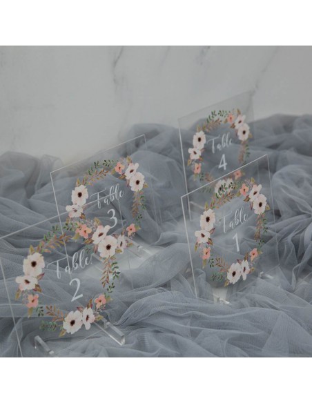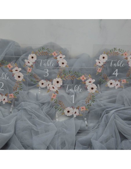 Personnalisez vos numéros ou noms de table avec un décor floral imprimé en vernis relief UV sur plexi transparent ou effet givré.