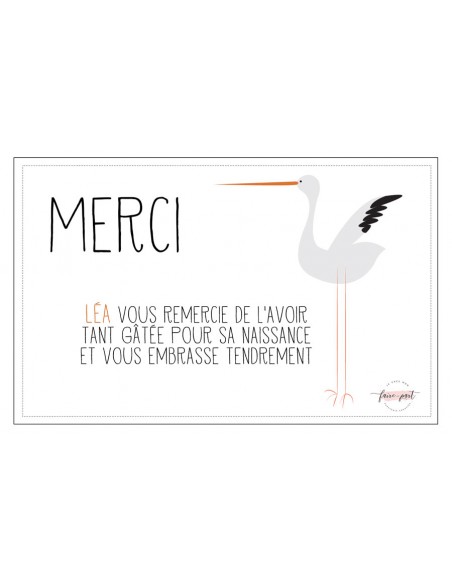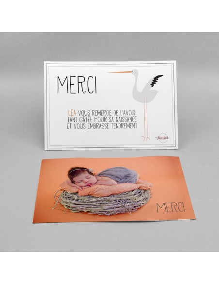 Carte de remerciements naissance avec un dessin de cigogne très mignonne pour remercier vos proches.