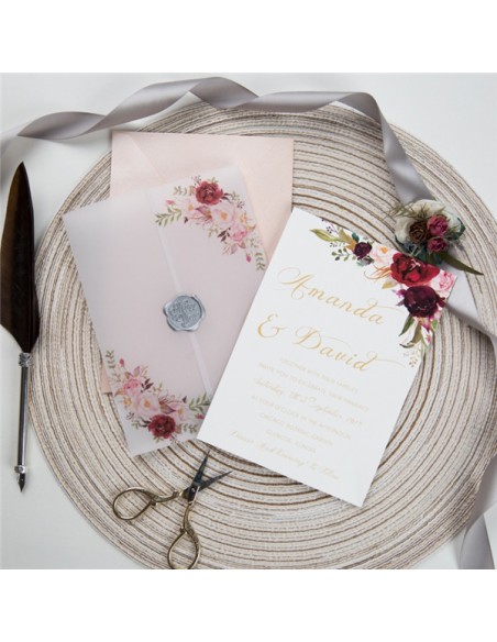 Un faire-part floral composé d'une pochette en calque avec une impression numérique d'un motif fleuri et d'un carton d'invitation.
