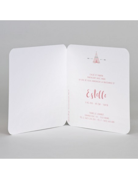 Faire-Part de naissance pour petite fille rose avec de joli tipi et flèche. Vous pouvez personnaliser ce faire-part de naissance avec la photo de votre petit bout pour accompagner votre texte d'annonce à l'intérieur.