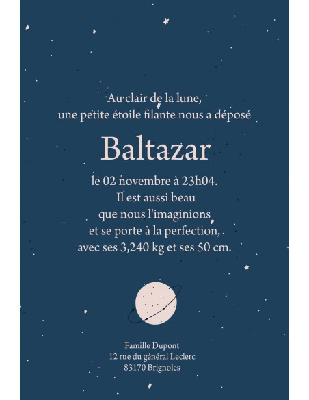 Faire-part naissance mixte sur le thème nuit étoilée pour annoncer avec plein de douceur la naissance de votre enfant.