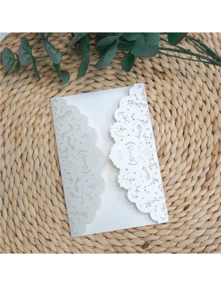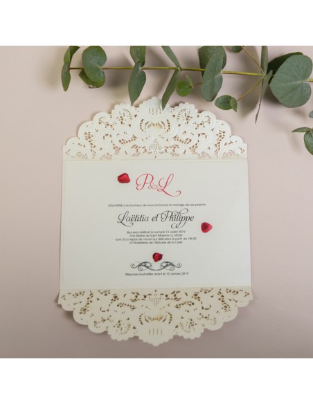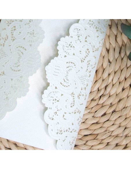 Une faire-part mariage en dentelle façon vintage qui s'ouvre en deux pour laisser apparaitre un carton d'invitation.