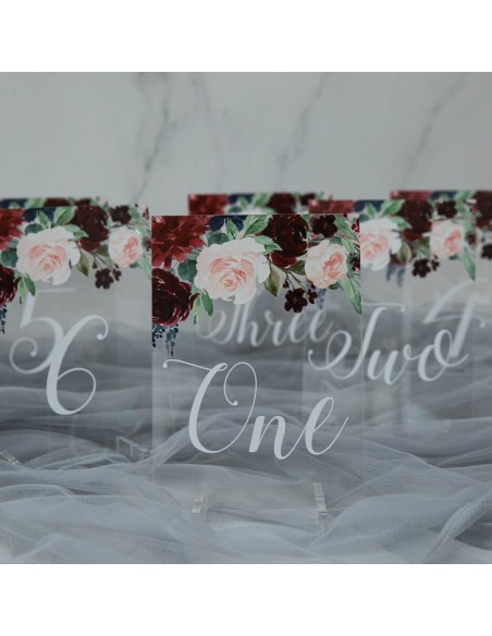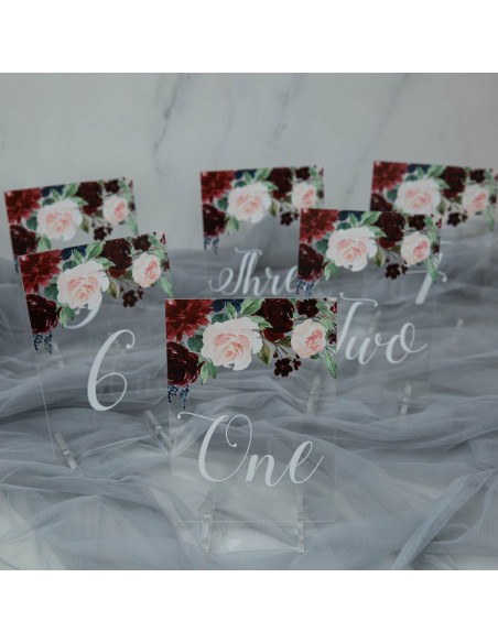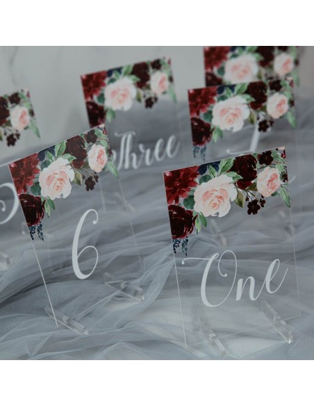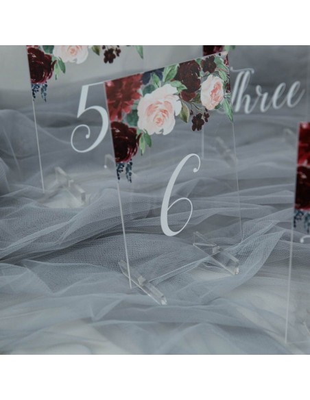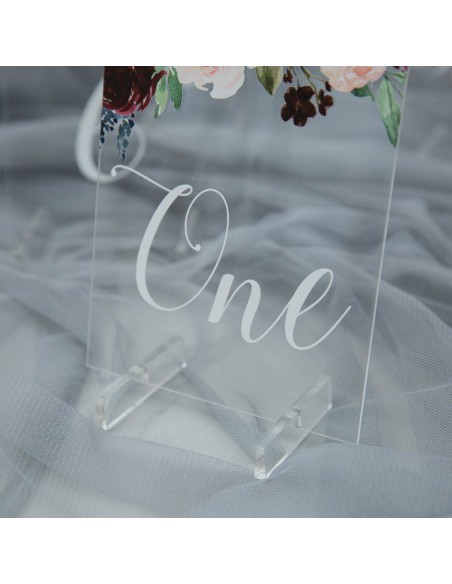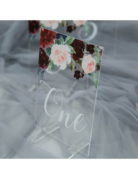 Personnalisez vos numéros ou noms de table avec un décor floral imprimé en vernis relief UV sur plexi transparent ou effet givré.