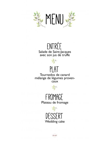 Un menu décliné de votre faire-part dans un design végétal et nature au thème verdure à personnaliser avec vos textes.